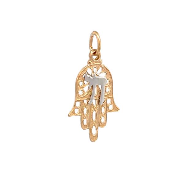 14K Yellow Gold Pierced Hand of God with 14K White Gold Chai